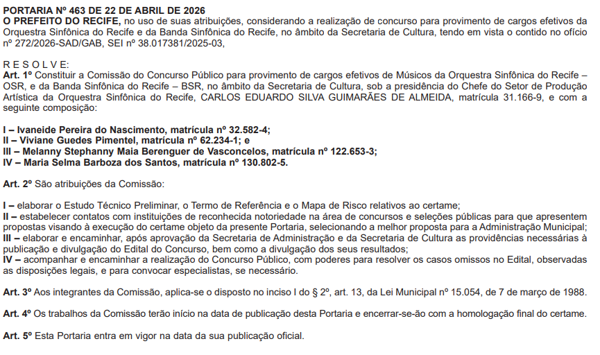 Foi formada a comissão responsável por conduzir os estudos e a organização do certame que deverá ofertar vagas para cargos efetivos ligados à música, com oportunidades destinadas à Orquestra Sinfônica e à Banda Sinfônica do município.