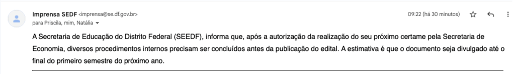 Por conta disso, o time de jornalismo do Estratégia Concursos entrou em contato com o setor de Imprensa da SEDF para checar essa e outras informações.
