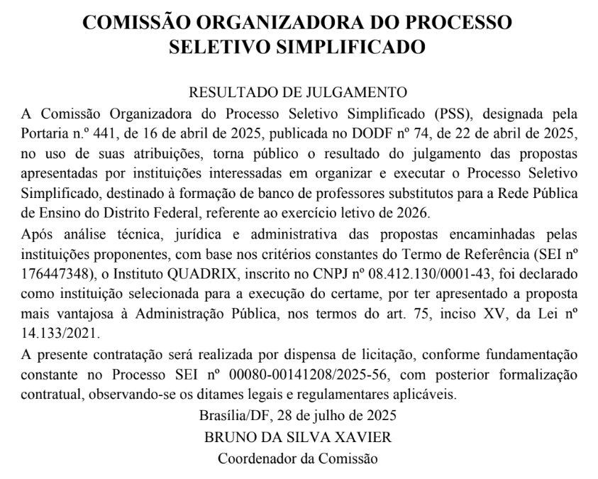 O Processo Seletivo Simplificado será destinado à formação de banco de professores substitutos para a Rede Pública de Ensino do Distrito Federal, referente ao exercício letivo de 2026. Confira a publicação: