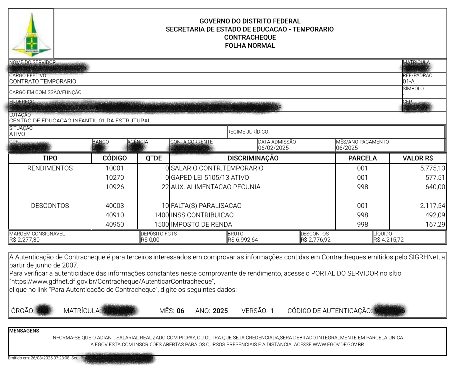 E não é só isso! O time do Estratégia Concursos teve acesso ao contracheque de um professor temporário. O vencimento bruto é de R$ 6.992,64, veja: