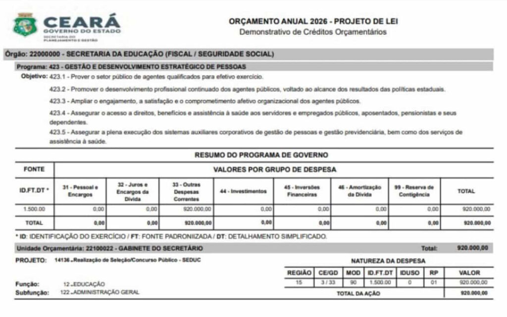 O Projeto de Lei Orçamentária de 2026 traz a realização de novo concurso público para a Secretaria de Educação.