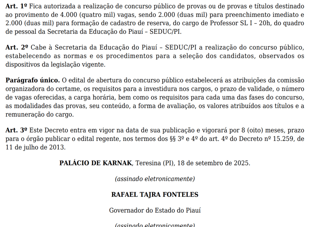 Foi publicado o decreto que autoriza a realização do novo concurso Seduc PI, da Secretaria de Educação do Estado do Piauí!