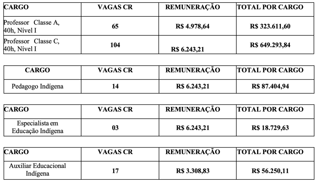 Cargos, vagas e remunerações