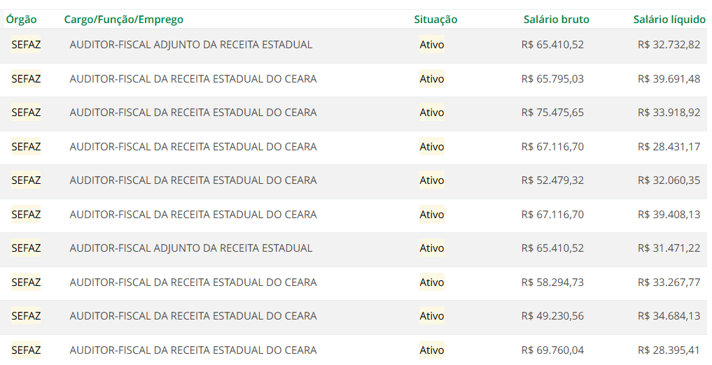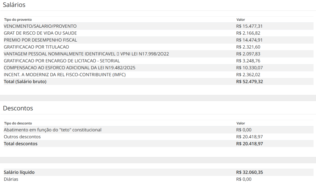 Apesar destes valores acima, há servidores no Portal da Transparência que recebem valores de R$ 28,3 mil a R$ 39,6 mil líquidos.