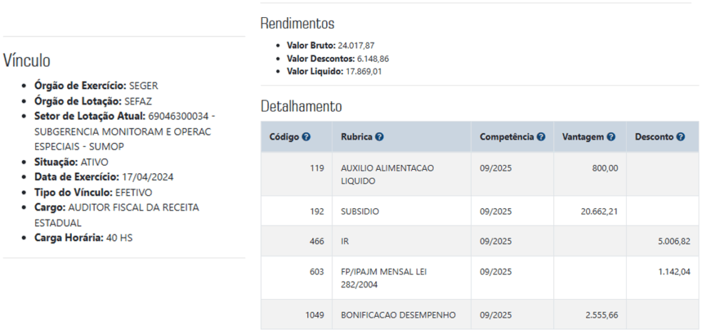 Para exemplificar ainda melhor, trouxemos abaixo o valor real recebido por um servidor aprovado no último concurso e empossado em 2024. Conforme o detalhamento, o salário após os descontos obrigatórios é de R$ 17,8 mil: