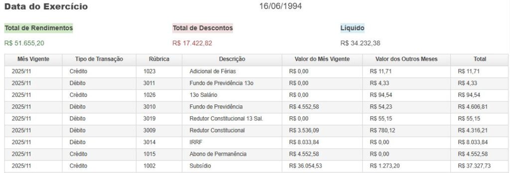 Conforme o detalhamento abaixo, é possível verificar que um servidor admitido através do último concurso recebe R$ 34 mil, já com os descontos: