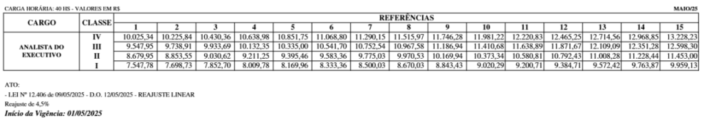 Atualmente, a remuneração inicial do Analista do Executivo é de R$ 7.547,78, podendo alcançar R$ 13.228,23 no fim da carreira.