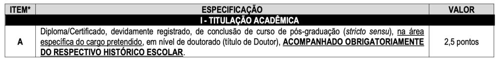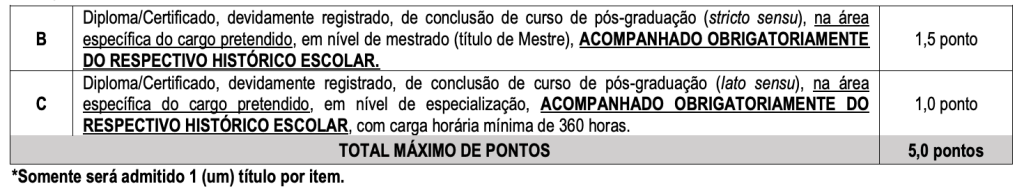 - Prova de títulos – Apenas para todos os cargos de magistério e superior-áreas técnicas.