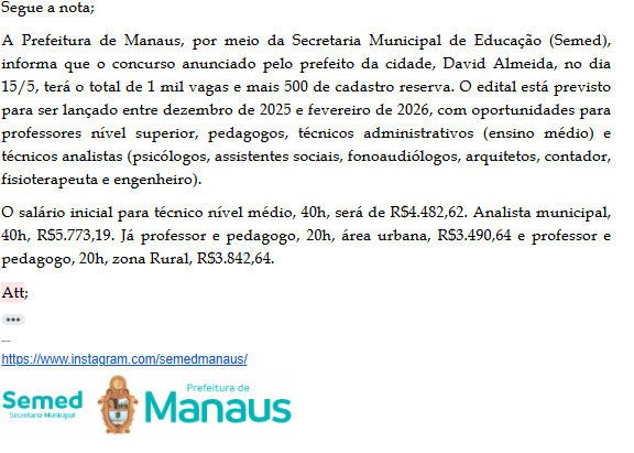 O Edital SEMED MANAUS está previsto previsto para ser lançado entre dezembro de 2025 e fevereiro de 2026.
