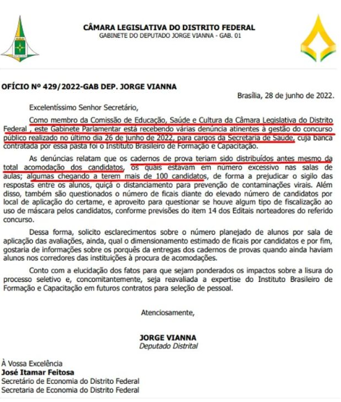 O deputado Jorge Vianna recebeu denúncias e solicitou esclarecimentos ao secretário de economia do DF, José Itamar Feitosa.