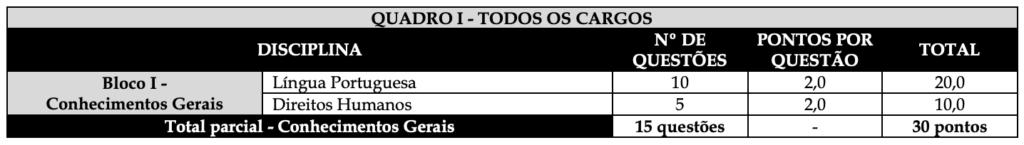 A prova objetiva foi composta por 40 questões de múltipla escolha, com 5 (cinco) opções (A a E) e uma única resposta correta. A etapa valeu até 60,00 pontos.