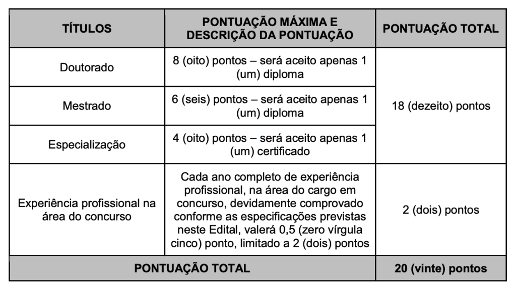 A Prova de Títulos terá caráter classificatório com pontuação máxima de 20 (vinte) pontos.