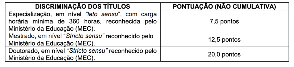 A Avaliação de Títulos será aplicada para todos os(as) candidatos(as) aprovados(as) na prova objetiva de conhecimento. Essa Avaliação valerá, no máximo, 20 (vinte) pontos.