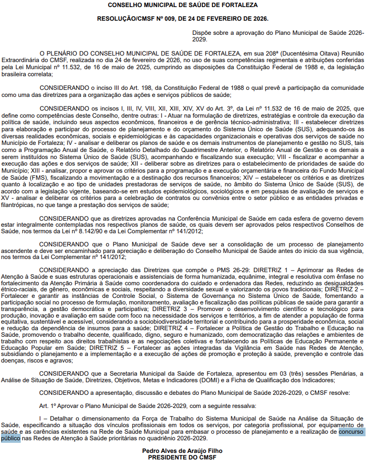 Foi aprovado o Plano Municipal de Saúde de Fortaleza 2026–2029, que estabelece diretrizes e metas para o fortalecimento do sistema público nos próximos anos.