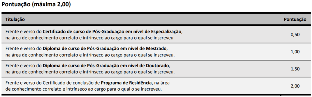 A Prova de Títulos, de caráter classificatório, para os cargos que exigem ensino superior, consistirá na avaliação de certificados de cursos de pós-graduação Stricto Sensu (Mestrado e Doutorado) e Lato Sensu (Especialização).