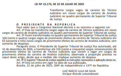 O texto permite ainda que o presidente do STJ transforme até 150 cargos de Técnico Judiciário, a serem desocupados, em cargos de Analista Judiciário, até dezembro de 2026. Confira: