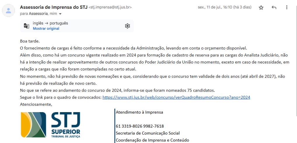 Por fim, no que se refere ao andamento do concurso STJ de 2024, consta que foram nomeados 75 candidatos. Confira: