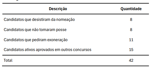 Essas perdas, por sua vez, foram justificadas pelos candidatos através da aprovação em outros concursos públicos, o que fez eles desistirem do cargo atual.