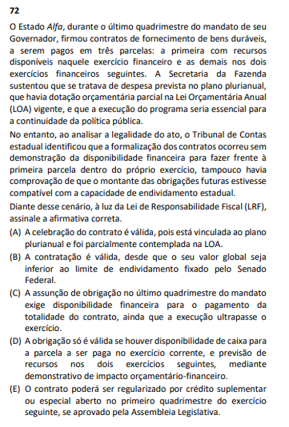 Tanto é assim que, na prova para o cargo Analista de Gestão – Julgamento (TCE-PE), a estimada Banca, ao delinear cenário semelhante na questão nº 73 da prova tipo 1 (contratos para a construção de centros comunitários e praças em bairros carentes com parcelas a serem pagas no último ano de mandato e no ano seguinte) apontou como gabarito a seguinte alternativa: “D) A assunção de obrigações financeiras nos dois últimos quadrimestres do mandato é vedada, salvo se houver disponibilidade de caixa suficiente para o pagamento integral no exercício”.