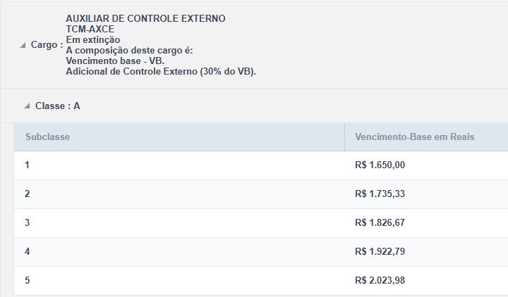 Auxiliar de Controle Externo – A composição deste cargo é: Vencimento base (VB) + Adicional de Controle Externo (30% do VB):