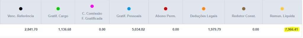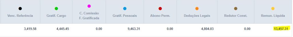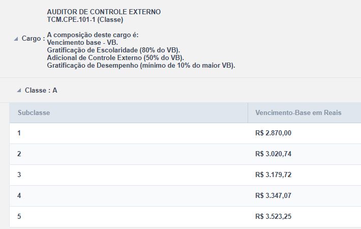 Técnico de Controle Externo – A composição deste cargo é: Vencimento base (VB) + Adicional de Controle Externo (40% do VB) + Gratificação de Desempenho (mínimo de 10% do maior VB):