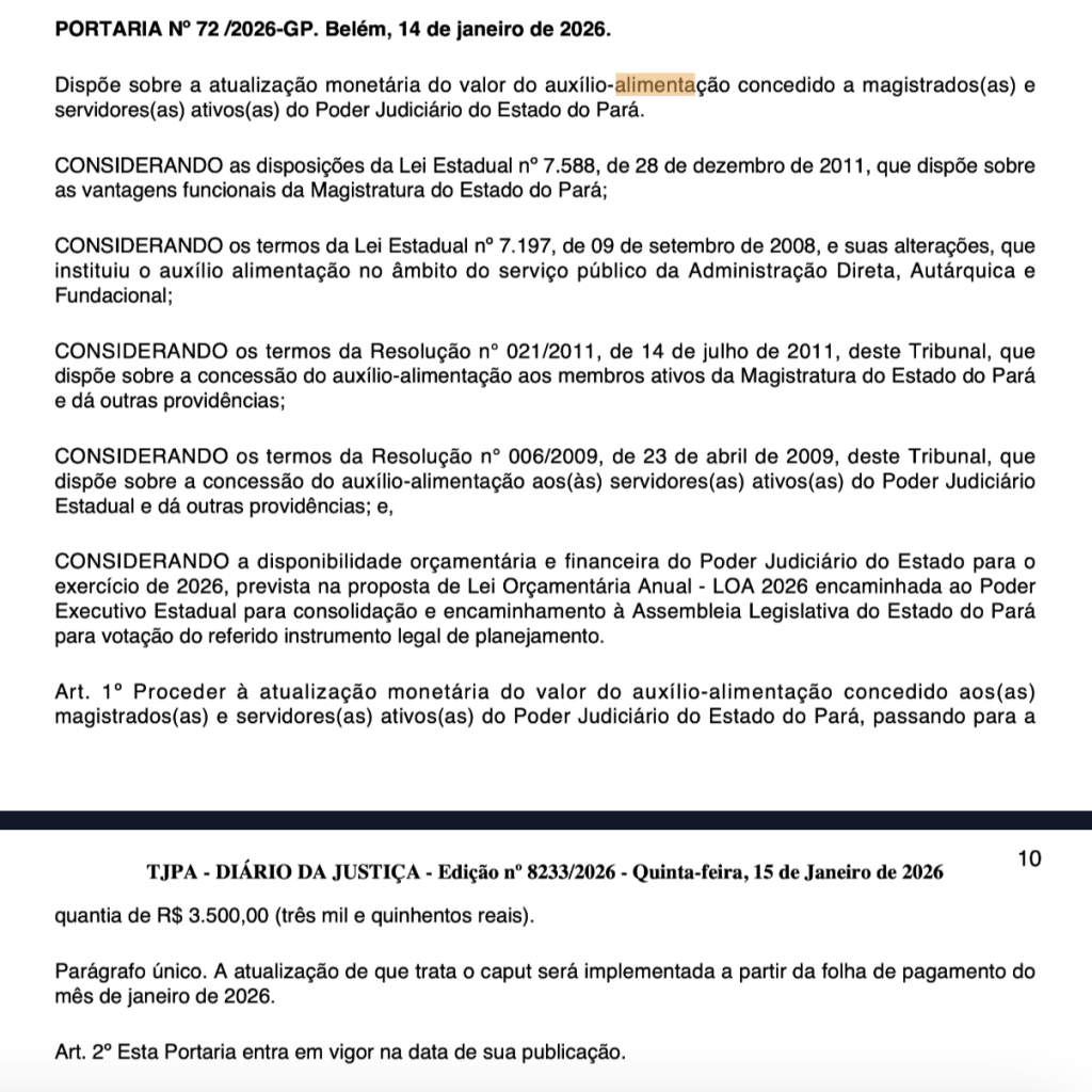 Akém disso, o reajuste já estava previsto na proposta de orçamento do Poder Judiciário enviada à Assembleia Legislativa do Pará para o ano de 2026.