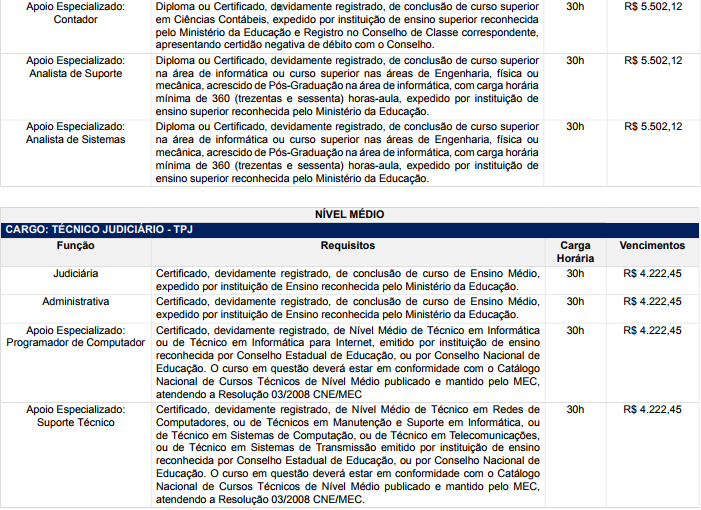►Remuneração inicial: variam de R$4.222,45 (médio) a R$5.502,12 (superior)