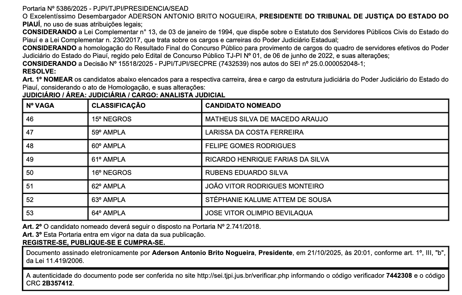 O concurso TJ PI ocorreu em 2022 e nomeou aprovados até 22 outubro de 2025: confira aqui a última nomeação.