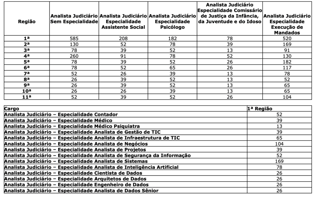As provas de Analista Judiciário, nas especialidades Médico, Médico Psiquiatra, Analista de Negócios (TI), Analista de Infraestrutura de TIC (TI), Analista de Sistemas (TI), Analista de Projetos (TI), Analista de Gestão de TIC (TI), Analista de Inteligência Artificial (TI), Analista de Segurança da Informação (TI), Cientista de Dados (TI), Arquitetos de Dados (TI), Engenheiro de Dados (TI) e Analista de Dados Sênior (TI) ocorrerão apenas na cidade do Rio de Janeiro – RJ.