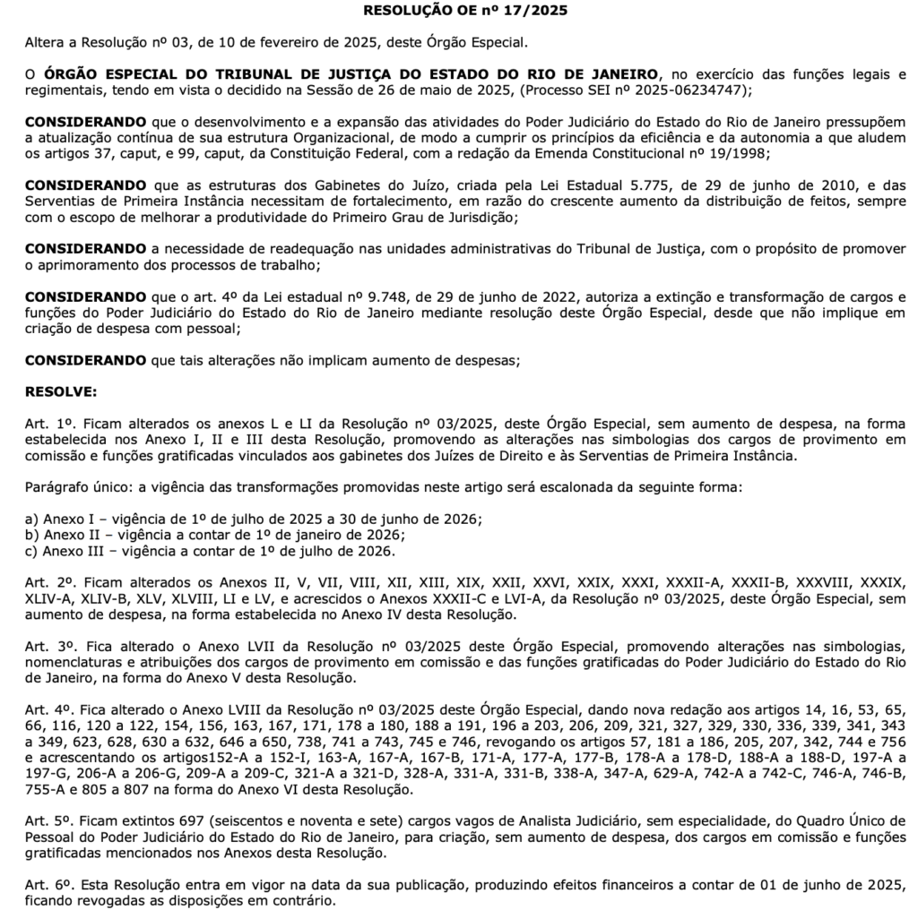 Segundo a resolução 17/2025, publicada no dia 27 de maio, foram extintos 697 cargos de Analista Judiciário – sem especialidade, do quadro de servidores do órgão.