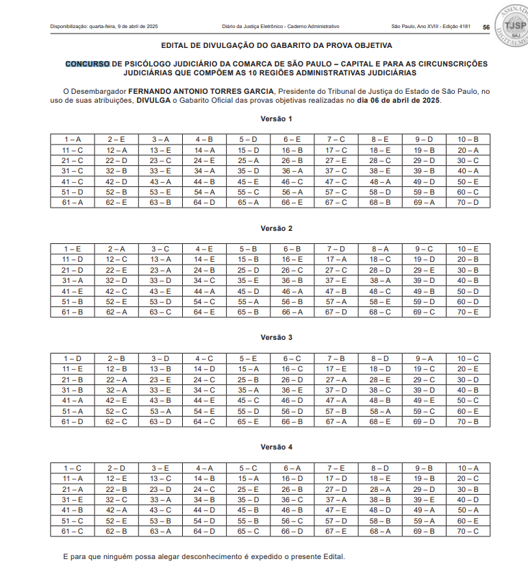 Você que fez a prova do concurso público do Tribunal de Justiça de São Paulo (TJ SP), o gabarito para o cargo de Assistente Social e e Psicólogo está disponível! Veja como foi o seu desempenho: