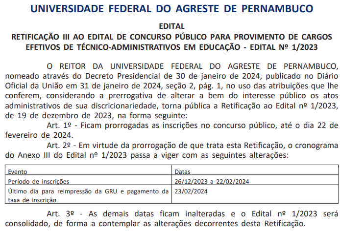 Foram divulgados os resultados da Universidade Federal do Agreste de Pernambuco (concurso UFAPE)! Confira abaixo: