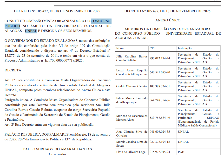 O governador de Alagoas, Paulo Dantas, anunciou no dia 28 de outubro de 2025, em evento no Palácio Museu Floriano Peixoto (Mupa), em Maceió, e transmitido, ao vivo, pelas redes sociais, detalhes de diversos concursos para o estado, entre eles, para a UNEAL.