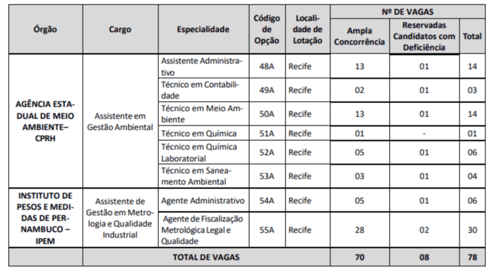 São 78 vagas distribuídas entre a Agência Estadual de Meio Ambiente (CPRH) e Instituto de Pesos e Medidas (IPEM). As remunerações variam entre R$2.189,17 e R$ 5.280,00. Os interessados poderão se candidatar até o dia 30 de novembro.