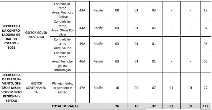 123 vagas para a Fundação de Aposentadorias e Pensões dos Servidores do Estado (FUNAPE), Secretaria de Administração (SAD), Secretaria da Controladoria-Geral do Estado de Pernambuco (CGE) e Secretaria de Planejamento, Gestão e Desenvolvimento Regional (SEPLAG).