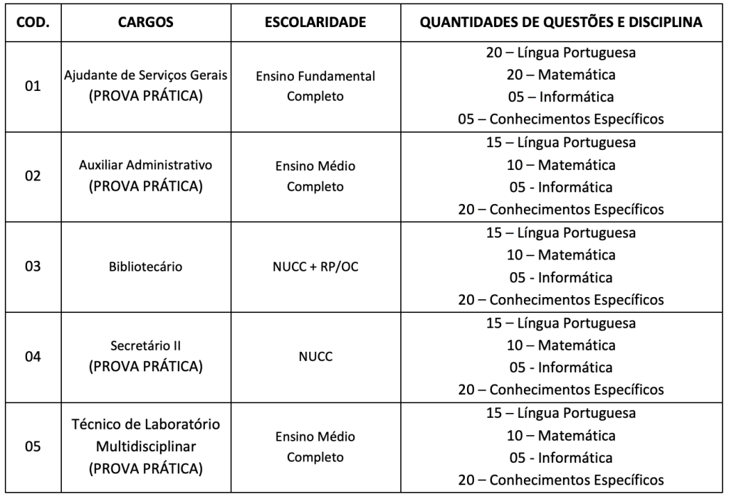 (NUCC: Nível Universitário Compatível com o cargo; RP/OC: Registro Profissional, ou inscrição em Órgão de Classe)