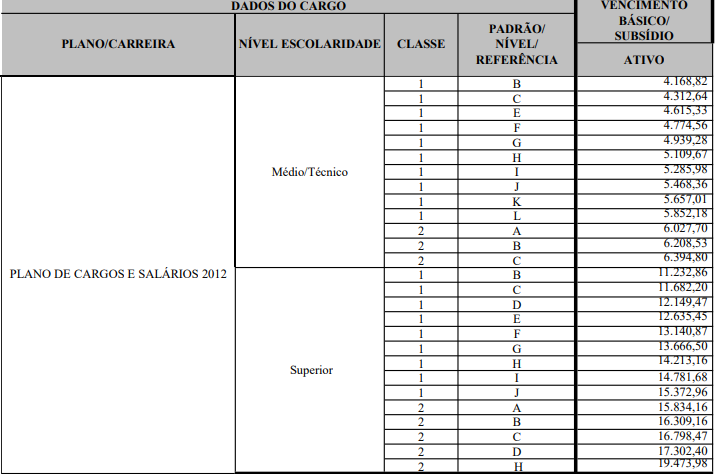 Conforme estrutura remuneratória vigente desde maio de 2025, o vencimento básico dos cargos de nível superior é de R$ 11.232,86, podendo chegar a quase R$ 20 mil no último nível.