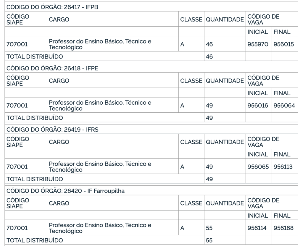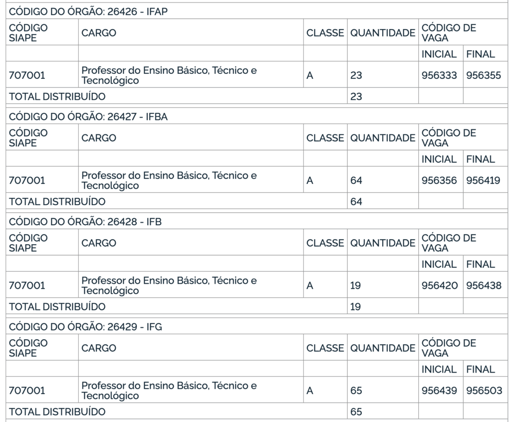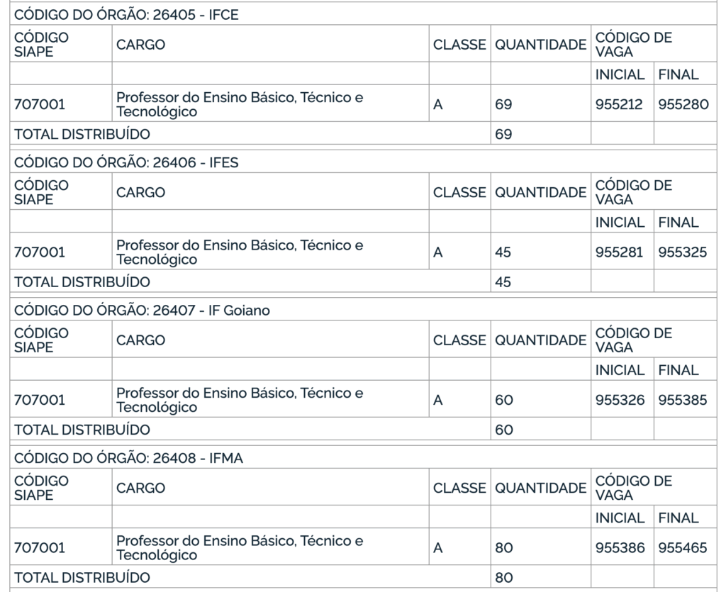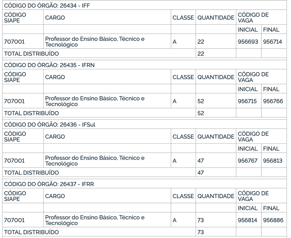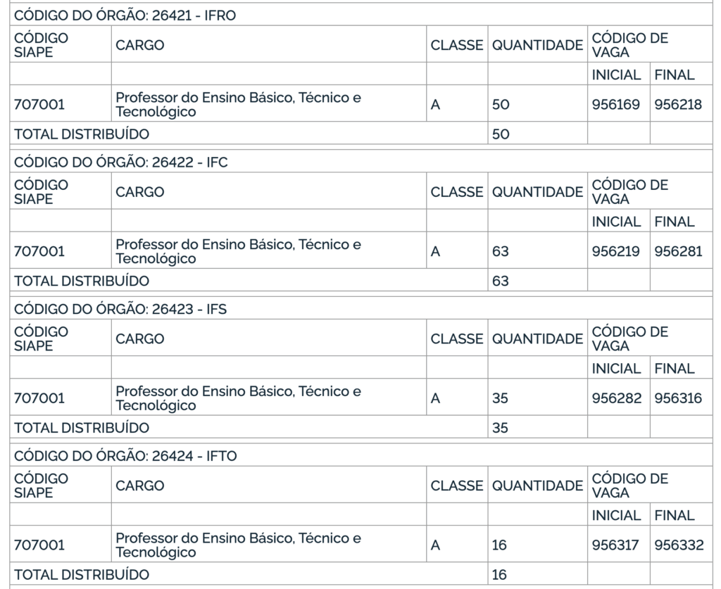 Foi publicada a portaria de Nº 787, DE 18 DE NOVEMBRO DE 2025 que redistribui, do Ministério da Educação para as Instituições de Ensino que integram a Rede Federal de Educação Profissional, Científica e Tecnológica, 2.022 cargos e vagas de Professor do Ensino Básico, Técnico e Tecnológico.