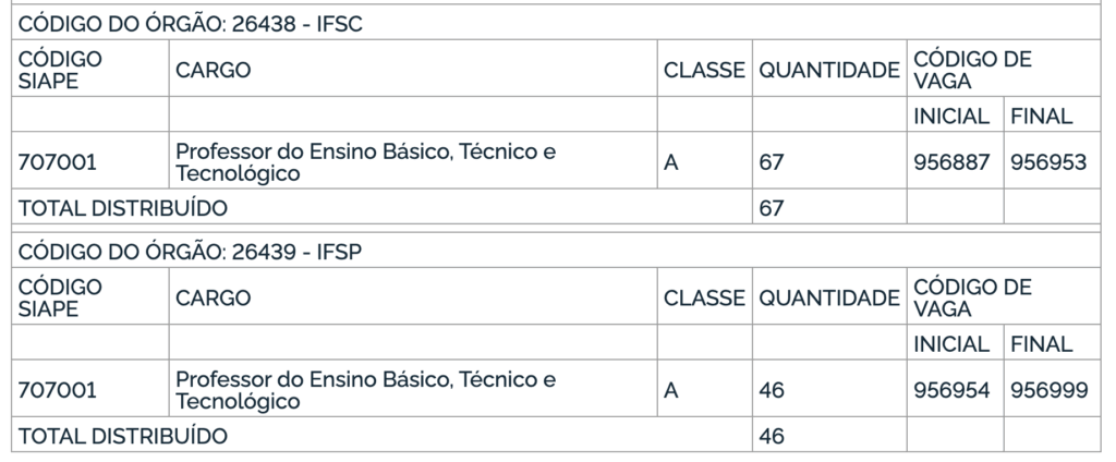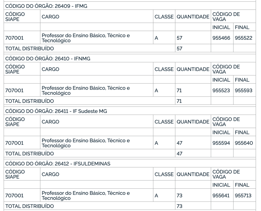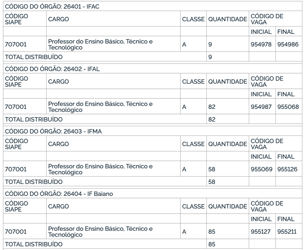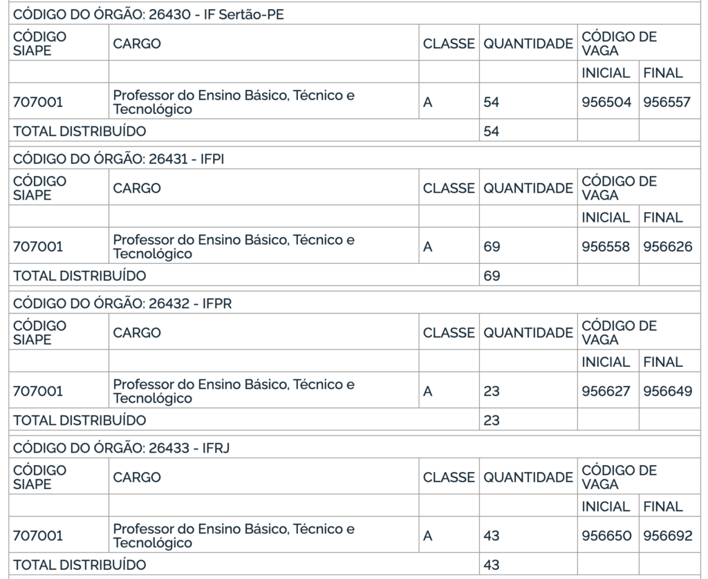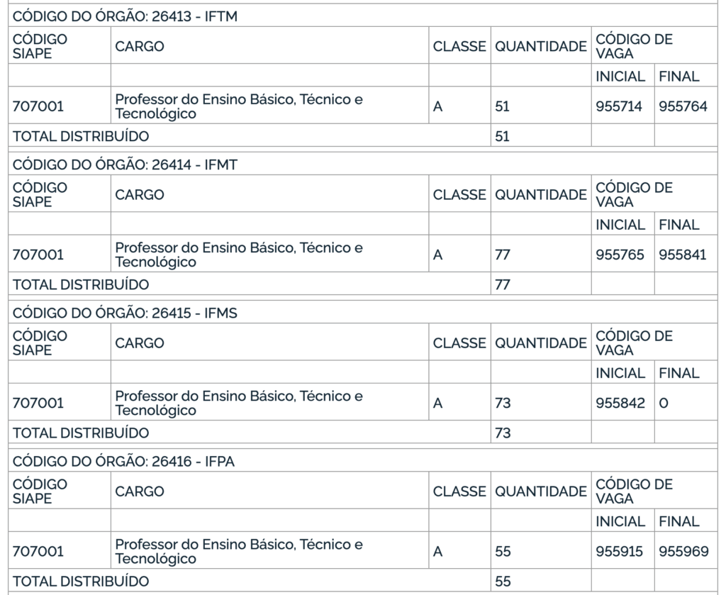 Foi publicada a portaria de Nº 787, DE 18 DE NOVEMBRO DE 2025 que redistribui, do Ministério da Educação para as Instituições de Ensino que integram a Rede Federal de Educação Profissional, Científica e Tecnológica, 2.022 cargos e vagas de Professor do Ensino Básico, Técnico e Tecnológico.