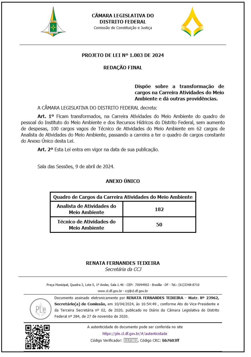 O primeiro PL refere-se ao IBRAM, em que transforma 100 cargos vagos de Técnico de Atividades do Meio Ambiente, de nível médio, para 62 cargos de Analista, de nível superior.