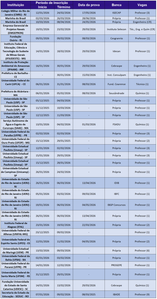 Lembro que semanalmente ou sempre que for houver novidades, vamos atualizar esse artigo e a relação de concursos abertos e previstos na área de química.