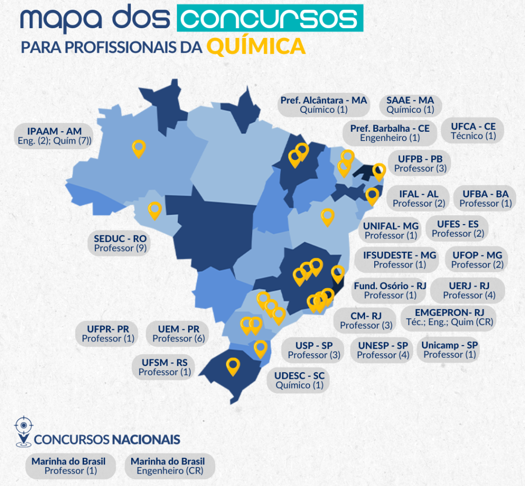 No mapa dos concursos na área de química abaixo, com detalhamento das oportunidades na Tabela seguinte, estão apresentados os concursos públicos abertos ou em andamento.