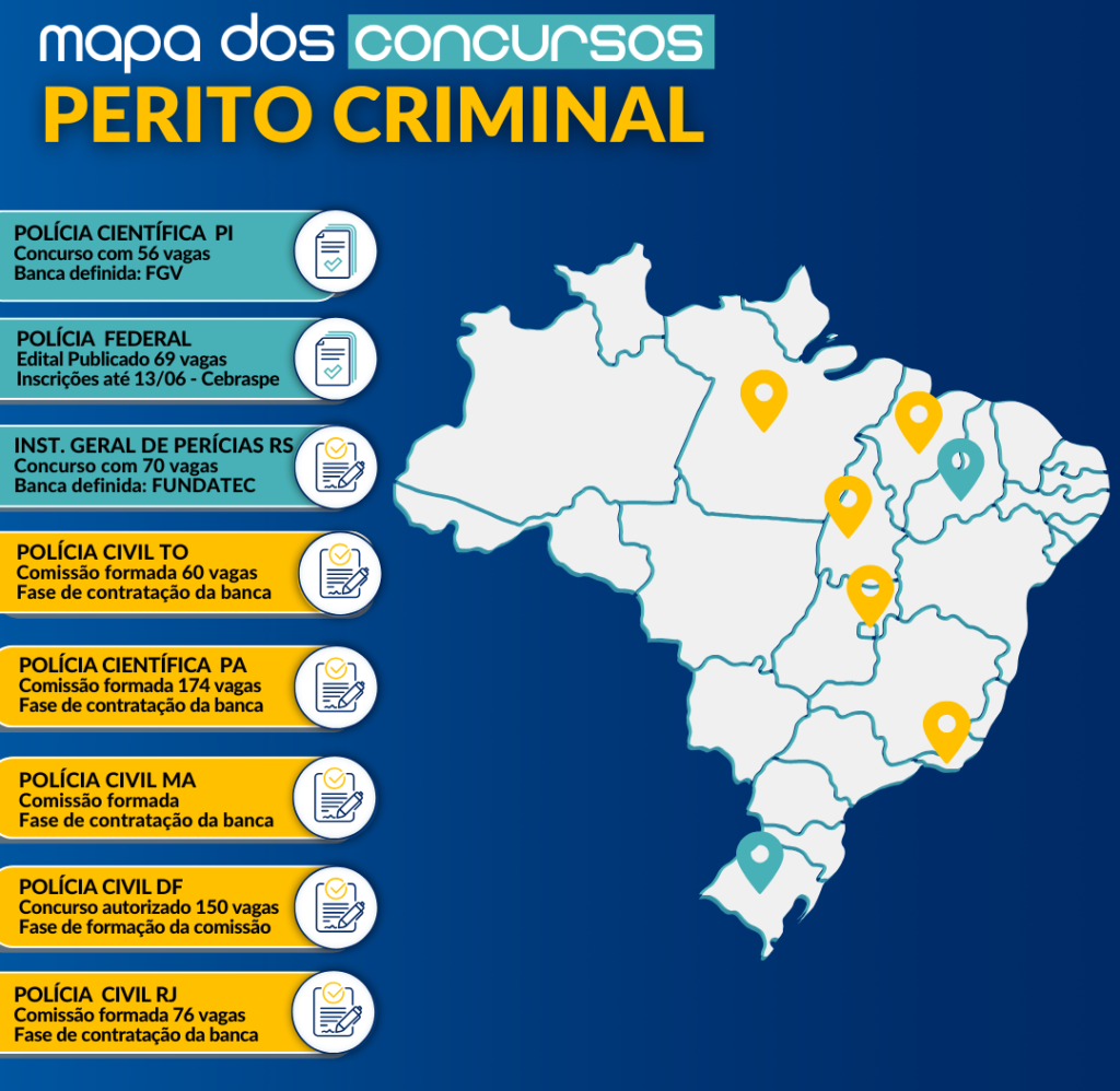 Como havíamos previsto, o ano passado foi recheado de oportunidades para Perito Criminal. A boa notícia é que 2025 não está sendo diferente. Oito grandes concursos estão em andamento: Polícia Civil PI com 56 vagas; Polícia Civil TO com 40 vagas; Perícia PA com 174 vagas; Perícia RS com 70 vagas; Polícia Civil DF com 50 vagas; Polícia Federal com 69 vagas; Polícia Científica SC e Polícia Civil do MA com vagas a definir.