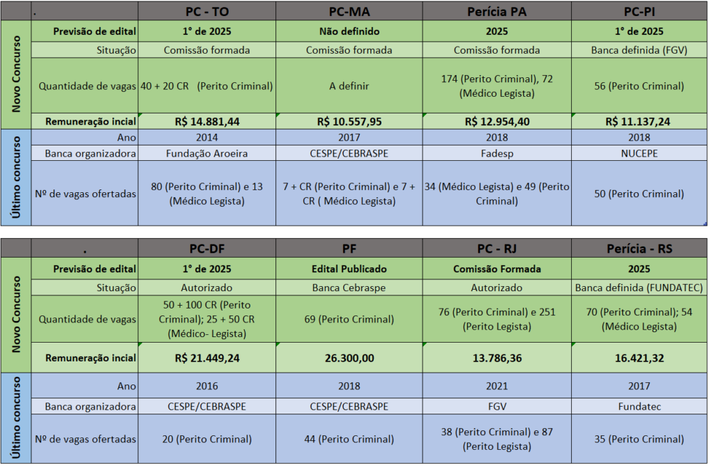 A principal novidade deste ano são os concursos para Perito Criminal da Polícia Civil do Distrito Federal (PCDF) e da Polícia Federal, que foram autorizados recentemente. Sendo o concurso da Polícia Federal com previsão de abertura de 69 vagas para Perito Criminal.