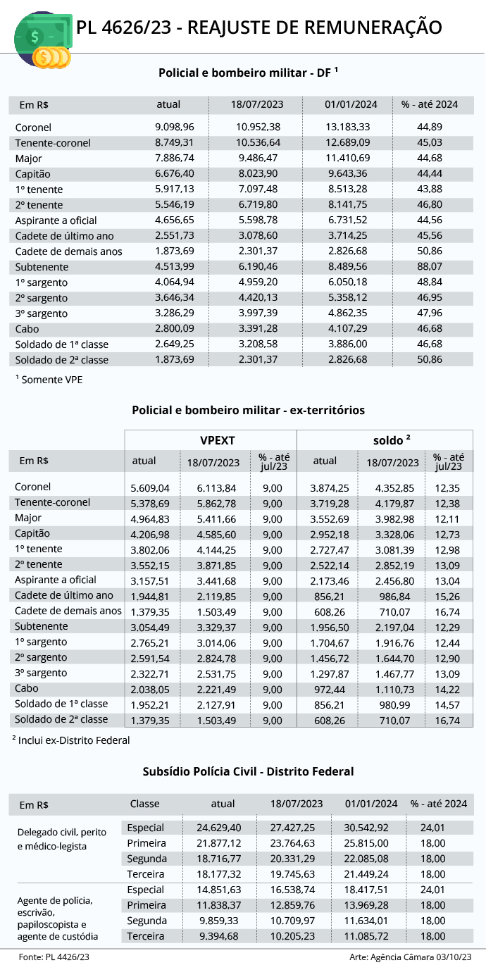 Foi aprovado nesta última quarta-feira, 4 de outubro, pela Câmara dos Deputados, o Projeto de Lei 4426/23 que, dentre outros itens, dispõe do reajuste salarial da Segurança do Distrito Federal (bombeiros e policiais militares e civis DF).