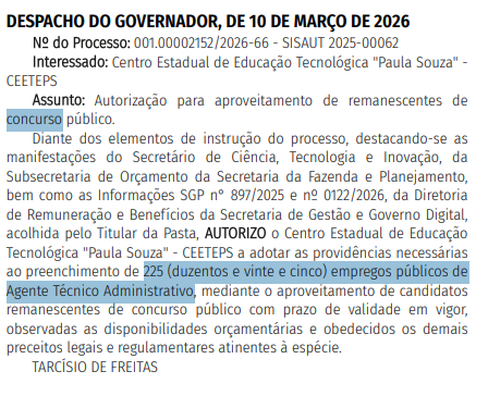 Um para o Centro Estadual de Educação Tecnológica Paula Souza de São Paulo (CEETEPS SP), com 225 vagas para Agente Técnico Administrativo.
