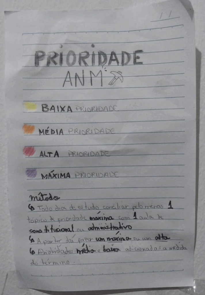 Eu dividi os tópicos do edital em quatro ordens de prioridade sendo elas: máxima, alta, média e baixa. No início eu fazia pelo menos um tópico de máxima prioridade, juntamente com um tópico de Direito Constitucional ou Administrativo (que eram matérias das quais eu estava tentando reforçar o aprendizado). Na medida em que as matérias de Direito Administrativo e Constitucional eram superadas, adicionava um tópico de máxima prioridade, em seguida um de média prioridade e, por último, um de baixa prioridade, caso houvesse tempo suficiente.