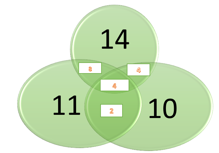 Após, de todas as demais interseções, diminuam o valor correspondente às 3(três) interseções a fim de não incorrer em dupla contagem. Vamos ver como fica nosso diagrama apenas com esses dados: