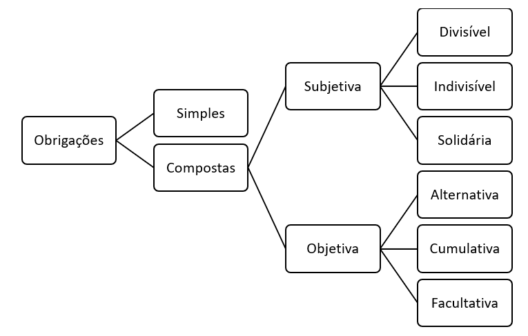 Quando há multiplicidade de objetos, as obrigações classificam-se em obrigação cumulativa, alternativa e facultativa. Por sua vez, quando há multiplicidade de sujeitos, podem ser divididas em obrigação divisível, indivisível ou solidária.