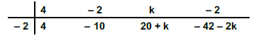 Comentários: Pela imagem que colocamos acima, sabemos que, se -2 é raiz, então (-42 – 2k) precisa valer 0(resto). Logo, (-42 – 2k) = 0, k = -21(gabarito).